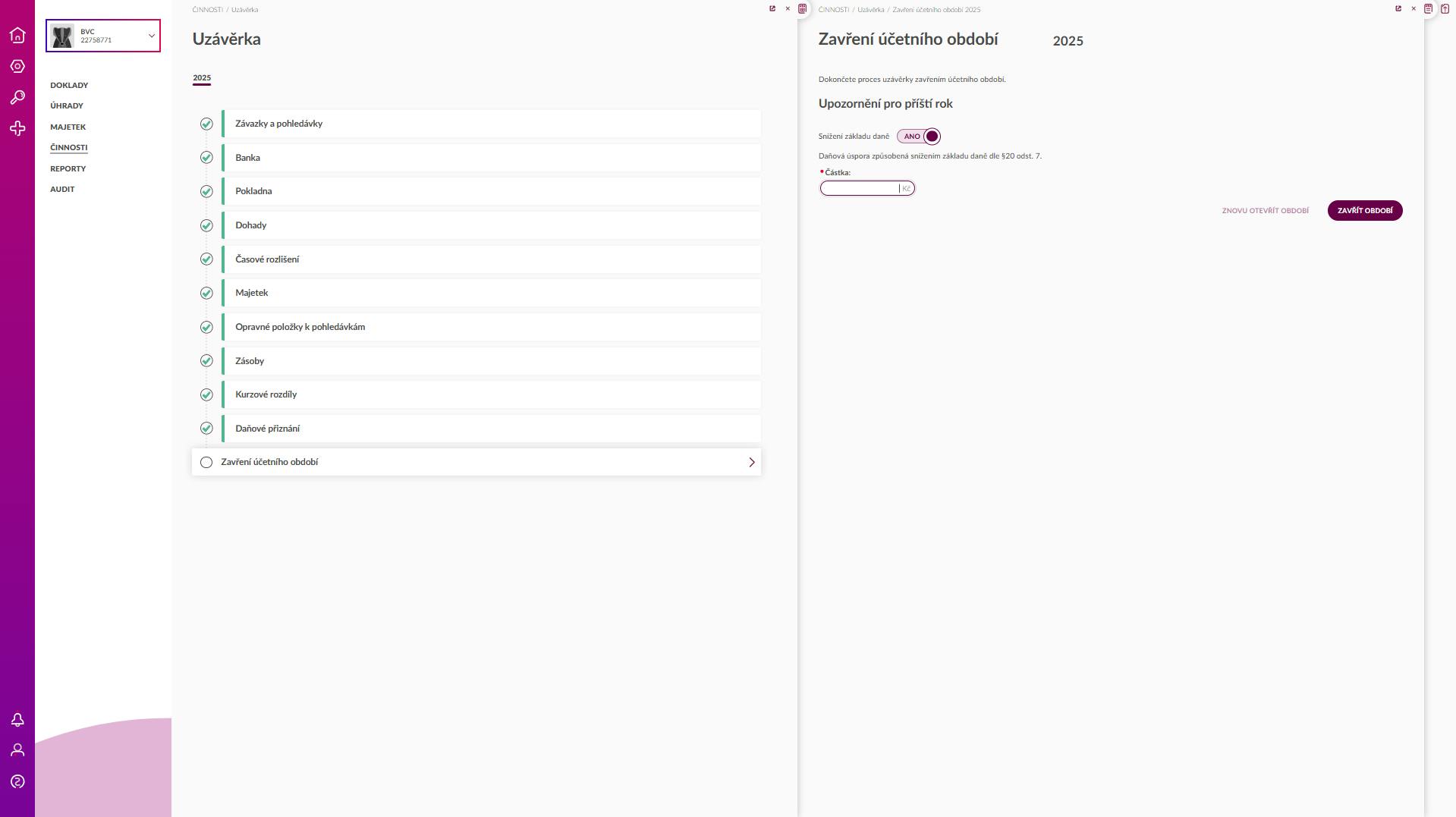 Proces uzávěrky probíhá v Evale jako soubor úkolů, které účetní musí provést, aby bylo možné dané období uzavřít. Na přehled těchto úkolů se dostanete přes menu Činnosti > Uzávěrka. Kliknutím na jednotlivá pole se na pravé straně obrazovky otevře formulář s konkrétními výsledky ze zvolené oblasti.