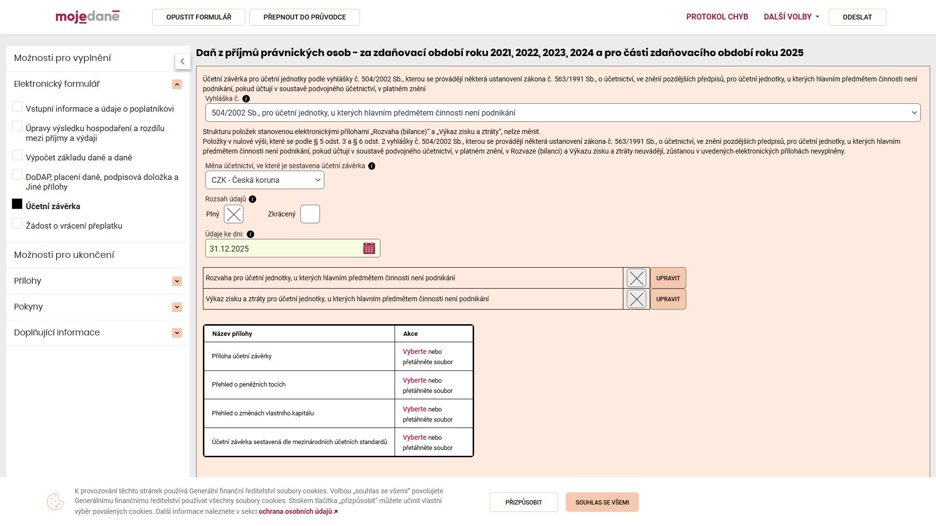 Zvolte kategorii účetní jednotky a pokud přiznání podává daňový poradce, přepněte tlačítko do polohy ANO. Tato informace se přenese do formuláře na portálu Moje daně.