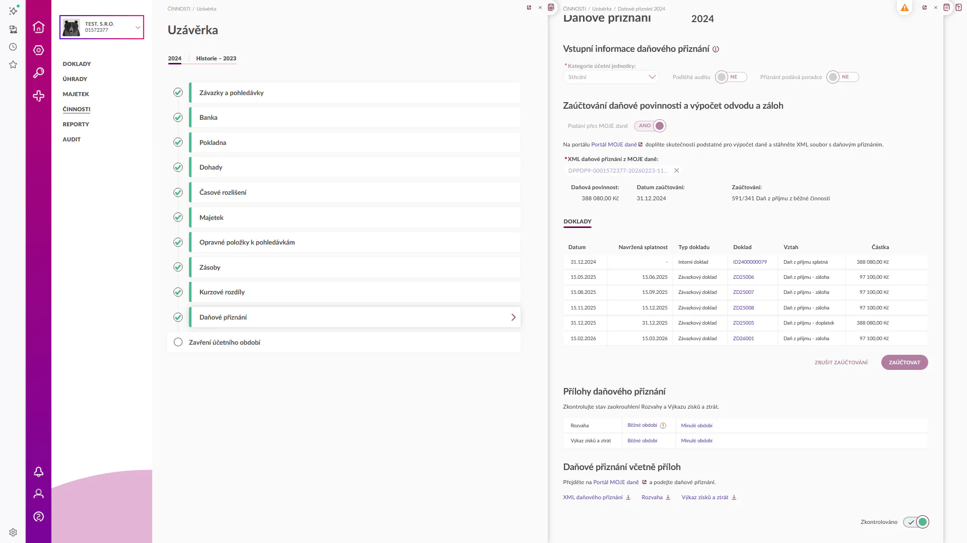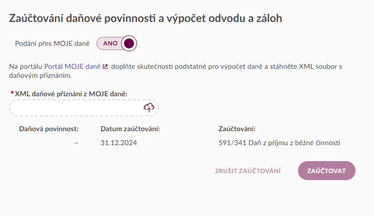- Evala vyčte ze souboru podání daňovou povinnost, kterou jednoduše zaúčtujete tlačítkem Zaúčtovat. Zkontrolujte doklady pro daňovou povinnost, doplatek/nedoplatek a zálohy, které Evala automaticky vytvořila