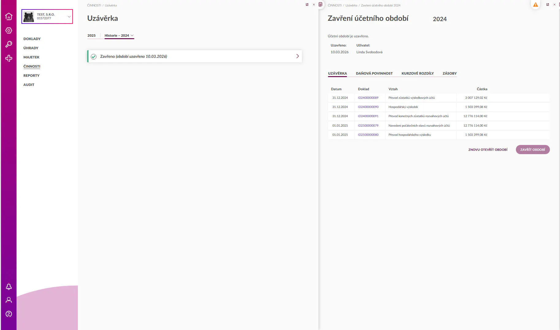 Uzavřené účetní období je možné znovu otevřít tlačítkem Znovu otevřít období. Tímto krokem dojde ke zrušení všech interních dokladů, které byly vygenerovány při zavření období. Provedené uzávěrky za minulá období si zobrazíte v rozbalovacím menu pod nadpisem stránky.