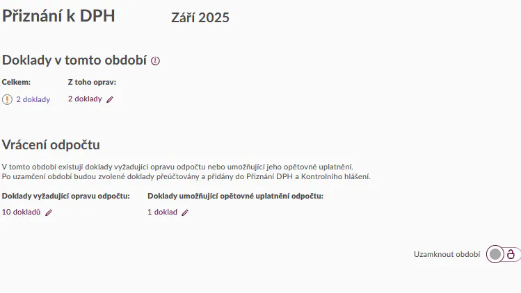 3. Analogicky je možné pod nadpisem Doklady umožňující opětovné uplatnění odpočtu nalézt odkaz seznam dokladů u kterých byl v předchozím období odpočet vrácen a nově lze po úhradě znovu uplatnit. Chování je v tomto případě totožné jako u Dokladů vyžadující opravu odpočtu.