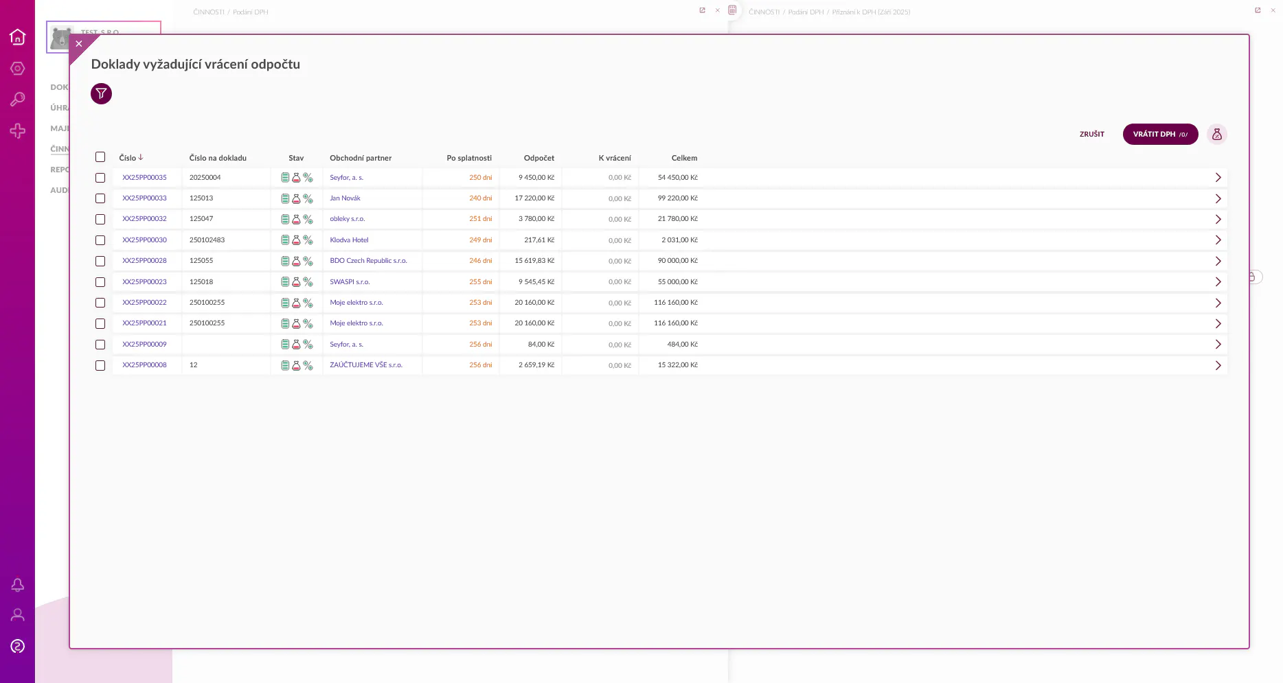 - Pod nadpisem Doklady vyžadující opravu odpočtu naleznete odkaz vedoucí na seznam dokladů, které nebyly uhrazeny a pro které je nutné provést vrácení již uplatněného odpočtu. Po kliknutí na odkaz je možné v tabulce vybrat doklady pro které chcete vrácení odpočtu provést. Při výběru je možné změnit částku vratky DPH, což může být užitečné v případě částečně uhrazených dokladů.