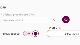 - V případě, že doklad splňuje výše uvedené podmínky, bude na formuláři v sekci DPH zobrazen přepínač Zrušit odpočet. Po přepnutí na hodnotu Ano bude zároveň zobrazeno pole Vratka DPH, obsahující částku dříve uplatněného odpočtu, kterou lze libovoně měnit.
